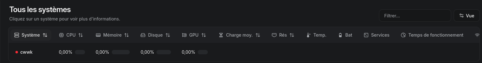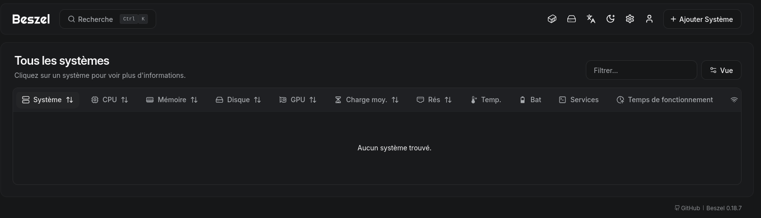 AprĂšs avoir dĂ©marrĂ© le hub, accĂ©dez Ă https://beszel.rnmkcy.eu ou Ă lâadresse choisie.