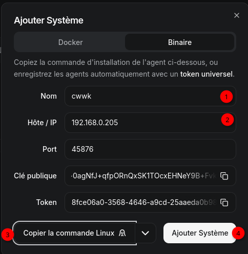 Cliquez sur le bouton Ajouter SystĂšme dans le coin supĂ©rieur droit pour ouvrir la boĂźte de dialogue de crĂ©ation du systĂšme. Nous ajoutons lâagent sur le hub cwwk