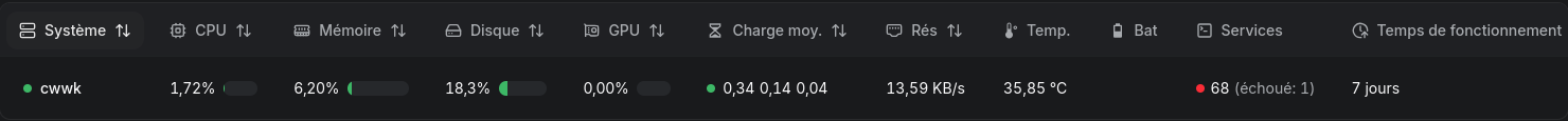 - Alerts: Alertes configurables pour CPU, mémoire, disque, bande passante, température, moyenne de charge et statut.