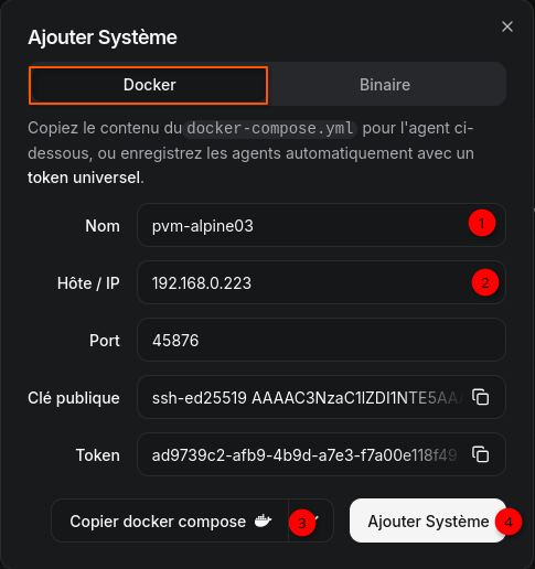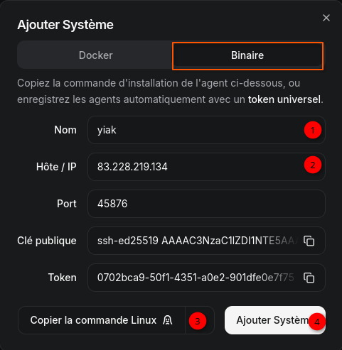 KEY: La clĂ© publique affichĂ©e lors de lâajout dâun systĂšme dans le Hub.TOKEN: UtilisĂ© pour authentifier lâagent (voir/settings/tokens).HUB_URL: UtilisĂ© pour la connexion WebSocket sortante (non nĂ©cessaire pour la connexion SSH).