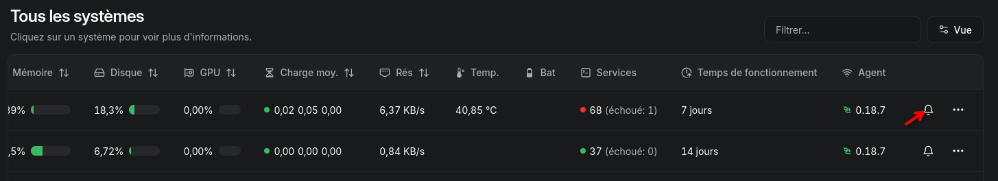 Depuis la page dâaccueil, cliquez sur la cloche en bout de ligne sur lâun des systĂšmes.