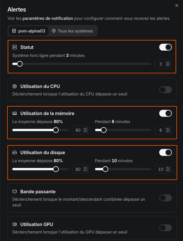 Un panneau latĂ©ral sâaffiche. Il permet de configurer les alertes pour le systĂšme sĂ©lectionnĂ© ou pour tous les systĂšmes. Le systĂšme est basique mais suffisant pour ĂȘtre alertĂ© en cas de problĂšme sur le serveur supervisĂ©.