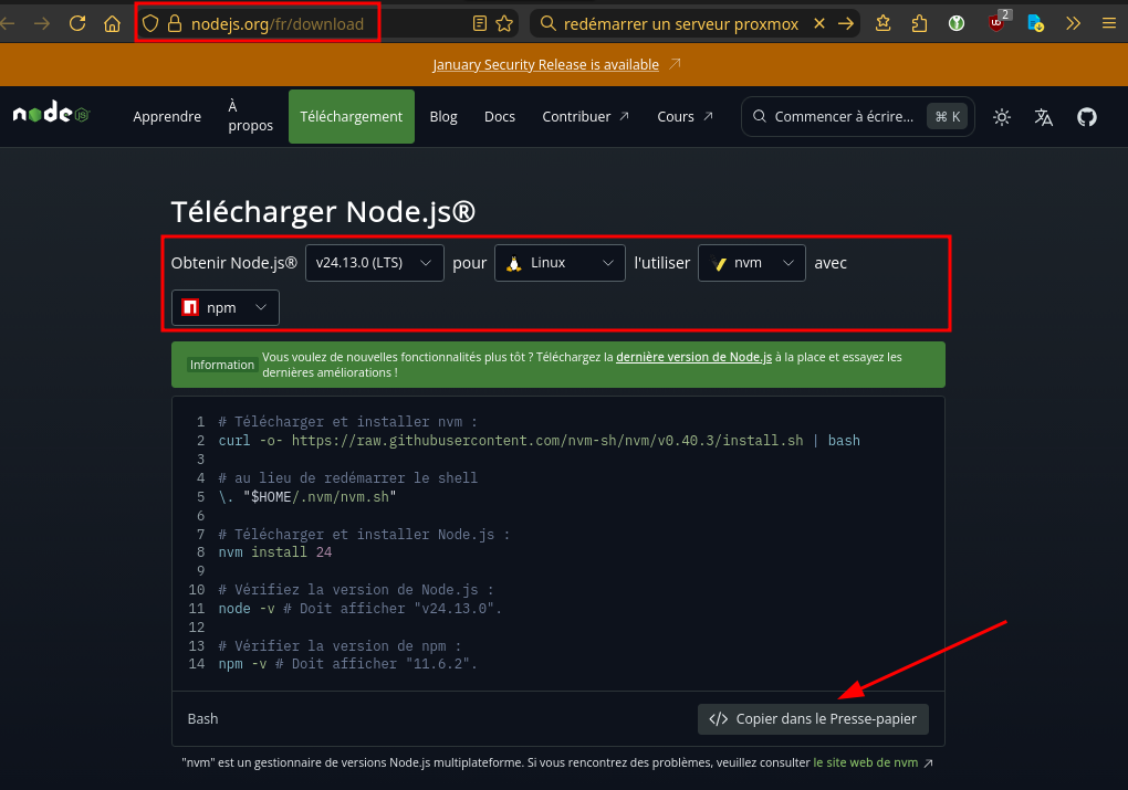 Voir lien https://nodejs.org/fr/download pour choisir la version à installer
