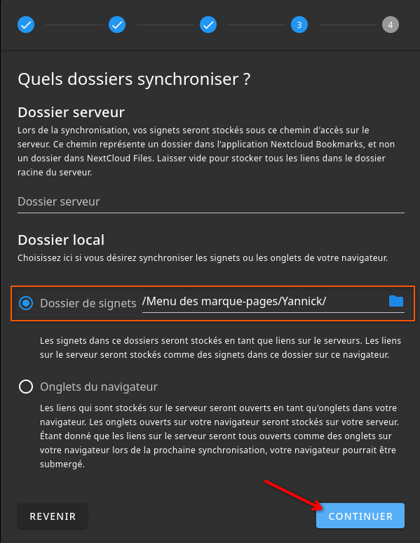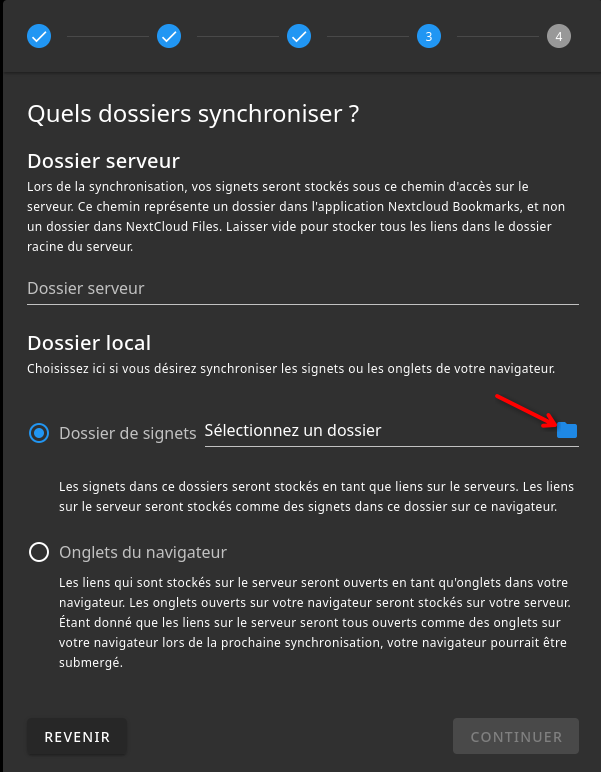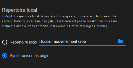 De retour sur le paramétrage de l’extension, cette dernière souhaite savoir, dans quel dossier nous allons synchroniser les favoris
