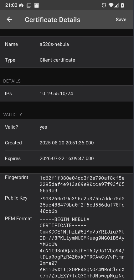 Envoi du certificat par messagerie, enregistrer dans un fichier $HOME/media/devel/nebula/a528s-nebula.key