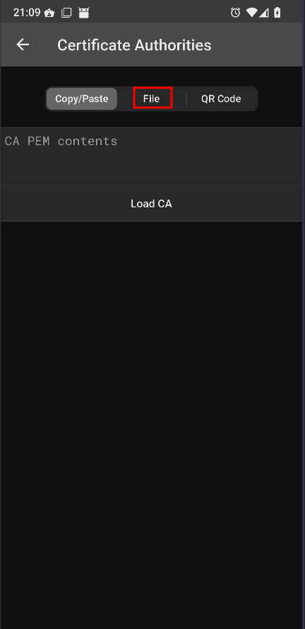 Téléchargez l’application (iOS/Android). Cliquez sur « + » pour ajouter une nouvelle configuration, puis copiez la clé publique de l’appareil (à partir de l’écran « Certificate ») sur votre ordinateur qui contient ca.key.
