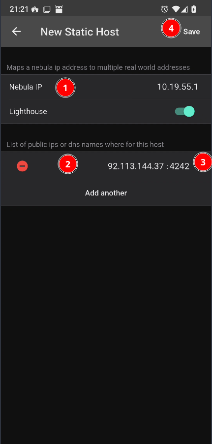 Dans l’écran « Hosts », “Add a new entry” définissez l’adresse IP de votre phare, ainsi que son adresse IP publique et son port. Activez l’option « Phare ».