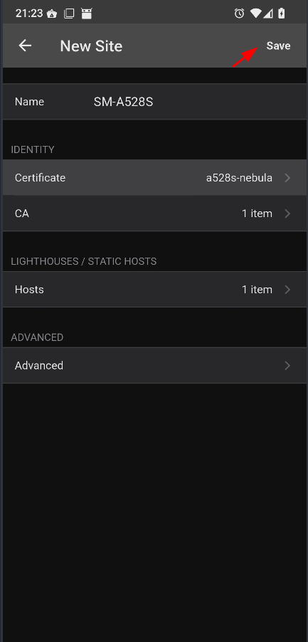 Choose file pour récupérer le certificat a528s-nebula.crt , puis “save”