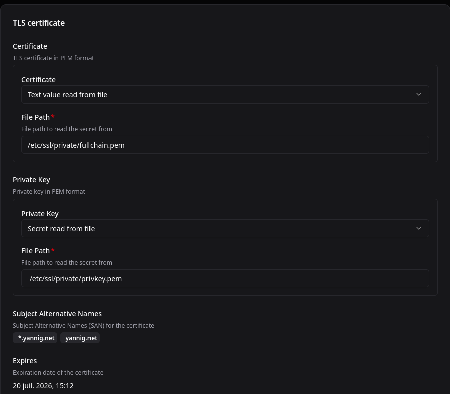 On copie le certificat /home/yann/.acme.sh/yannig.net_ecc/fullchain.cer et la clé /home/yann/.acme.sh/yannig.net_ecc/yannig.net.key