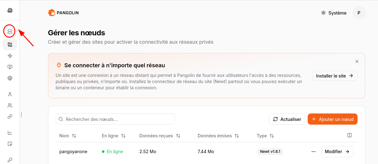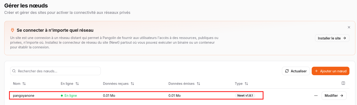 Rendez-vous sur votre instance Pangolin, partie Sites, c’est bien relié et Online :