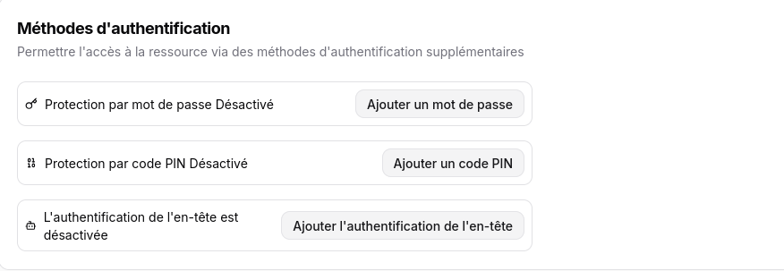 ✅ Méthodes d’authentification supplémentaires, telles que des liens d’accès temporaires et des mots de passe spécifiques à chaque ressource.