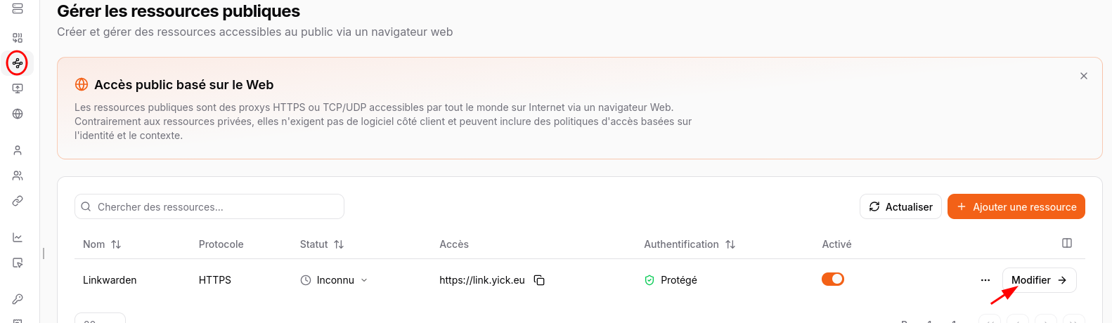 Pour partager une ressource avec un utilisateur, rendez-vous dans l’onglet Ressources -> Publique de votre instance Pangolin et cliquez sur Modifier :