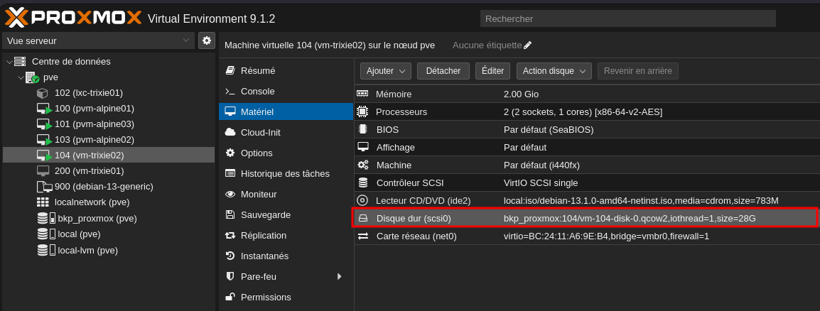 Sélectionnez la VM Debian 13 que vous souhaitez modifier.