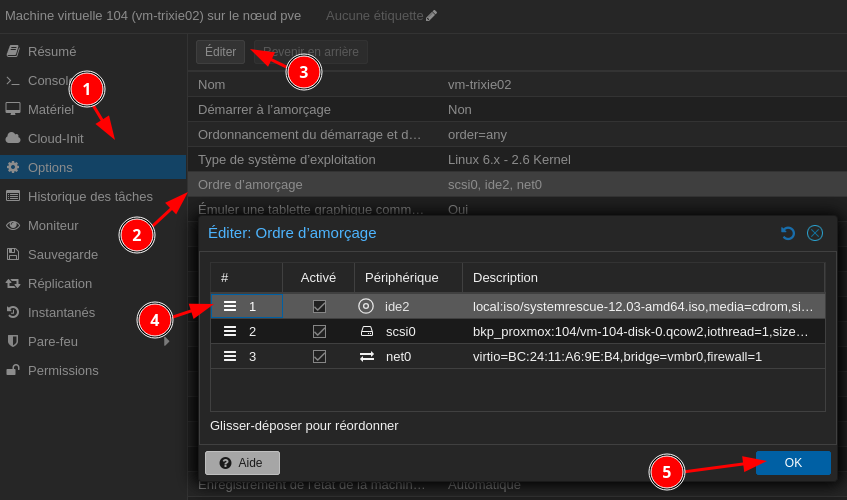 Dans les paramètres de votre VM, changez l’ordre de démarrage pour que SystemRescue soit en premier.