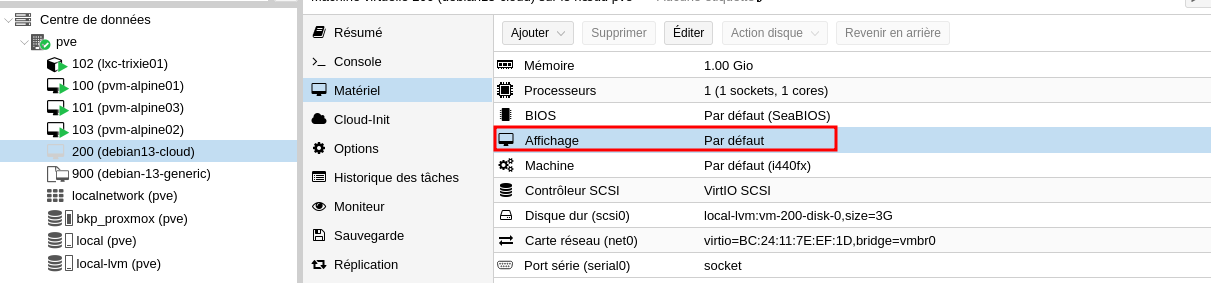 - Ajouter une interface VGA pour l’accès à la console sous Proxmox :