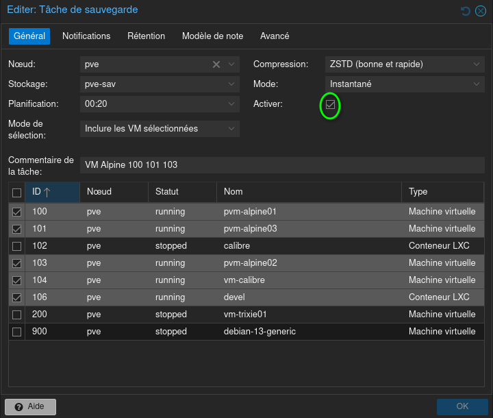 Et voilà votre job de sauvegardes configuré. Maintenant, chaque jour à 00h20 les machines virtuelles et conteneurs, en résumé l’intégralité du système va être sauvegardé.