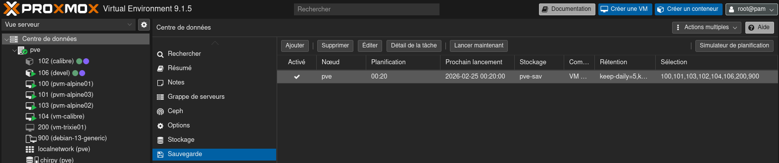 Et voilà votre job de sauvegardes configuré. Maintenant, chaque jour à 00h20 les machines virtuelles et conteneurs, en résumé l’intégralité du système va être sauvegardé.