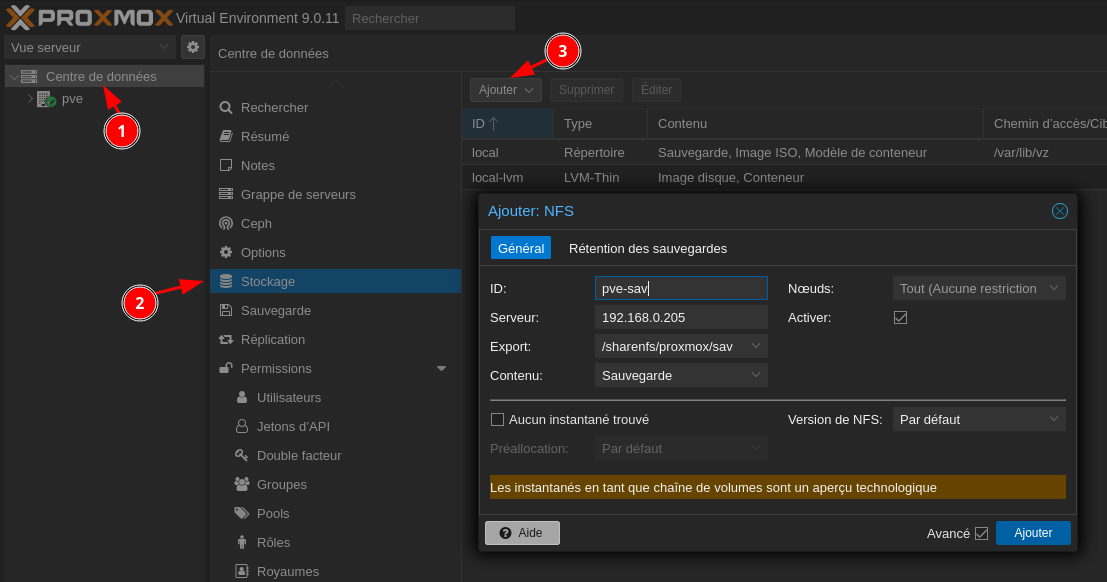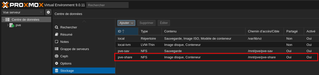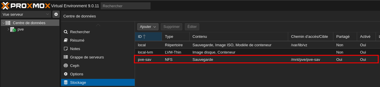 Ajouter un dossier partagé NFS pour la sauvegarde nommé pve-sav