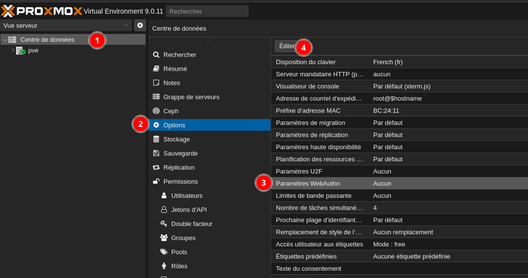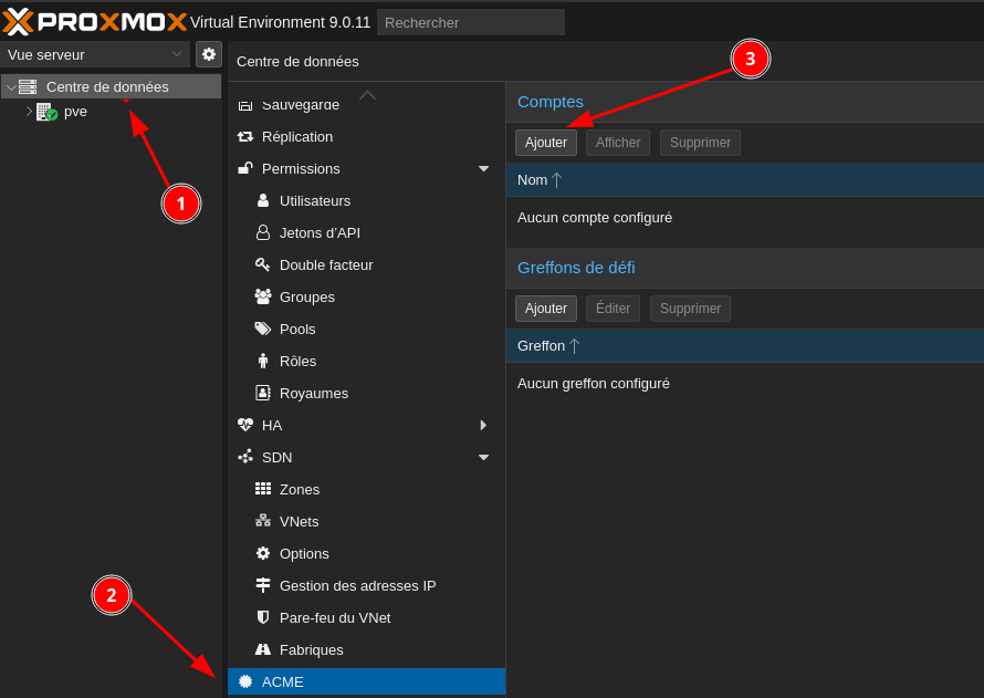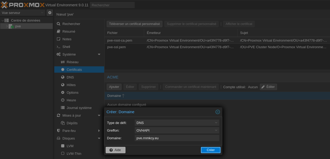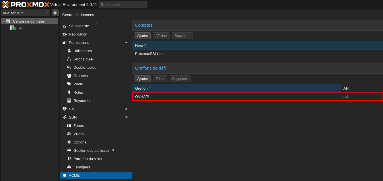 Ajouter les clés OVH dans PROXMOX : Dans le menu suivant : Centre de données –>ACME –> Greffons de défi –> Ajouter