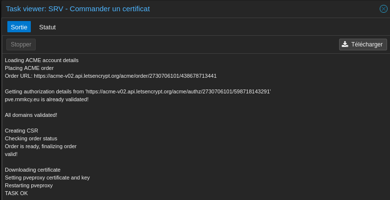On peut maintenant se connecter à la’adresse https://pve.rnmkcy.eu:8006 avec un certificat valide