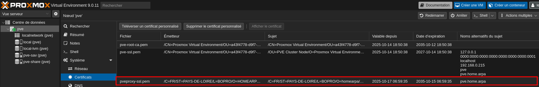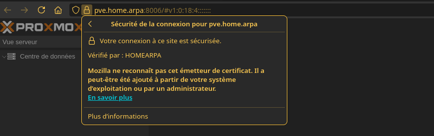 On peut maintenant se connecter à la’adresse https://pve.home.arpa:8006 avec un certificat valide