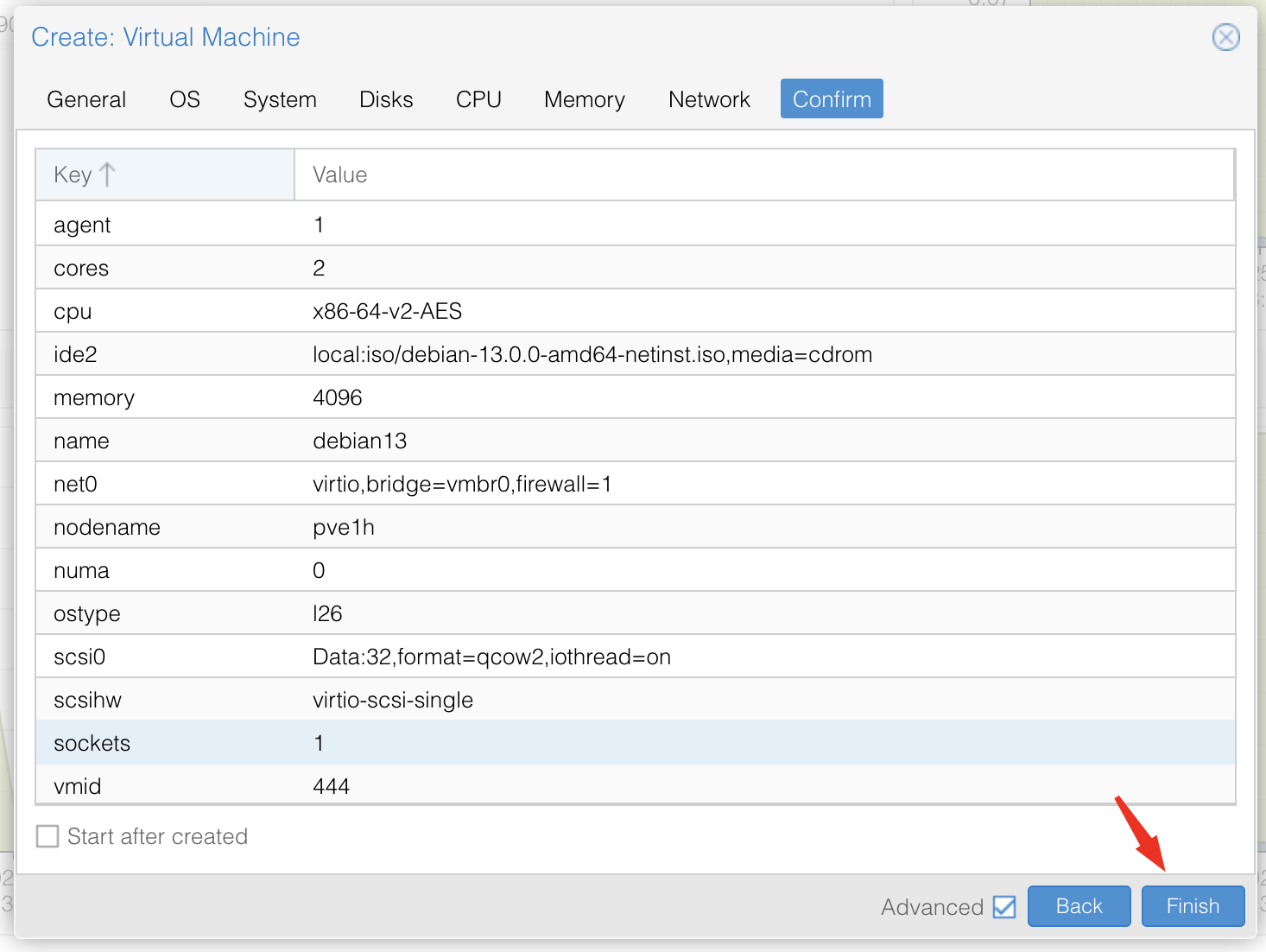 Ces paramètres permettent à Proxmox d’optimiser les pilotes virtuels et la gestion des ressources pour cette distribution.