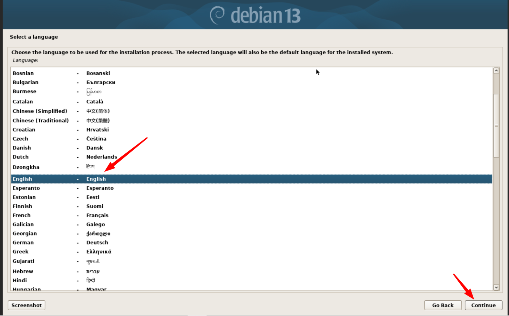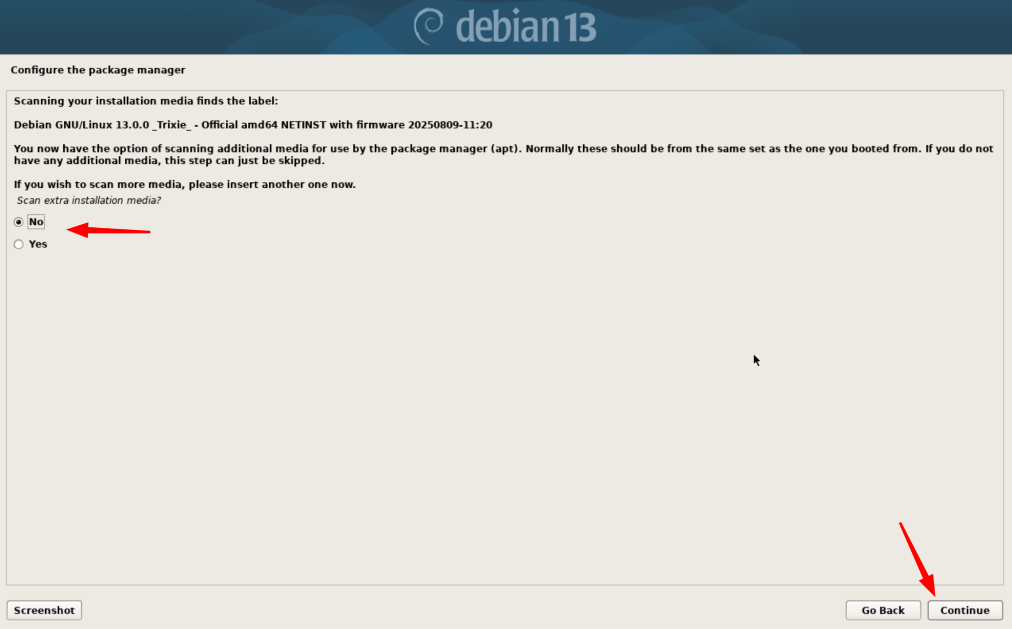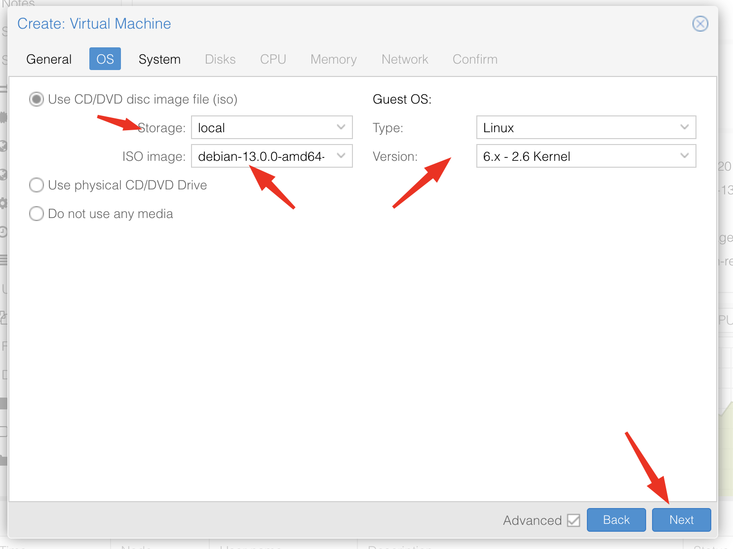 ISO image : choisissez l’image debian-13.0.0-amd64-netinst.iso ou celle que vous avez téléchargée.