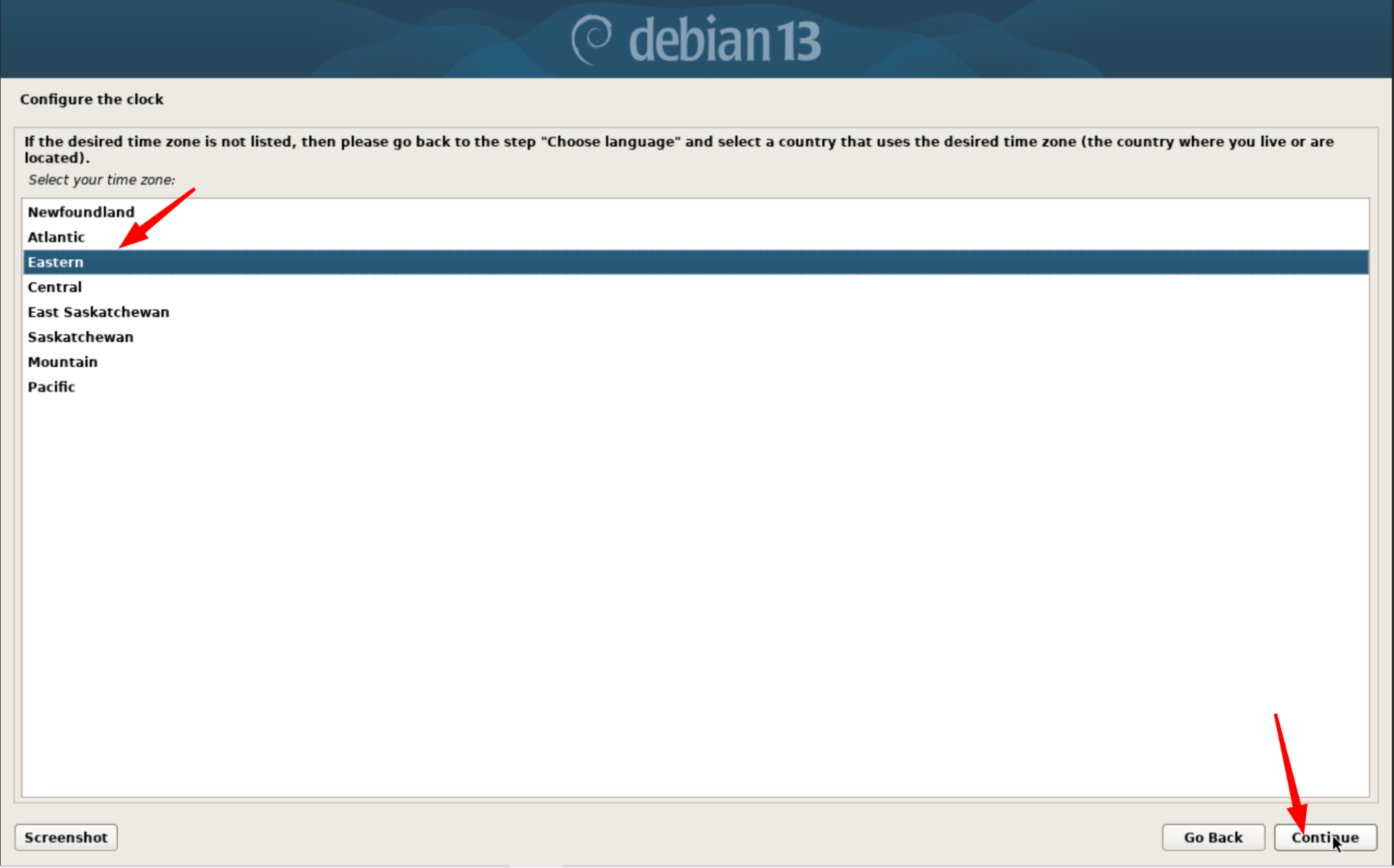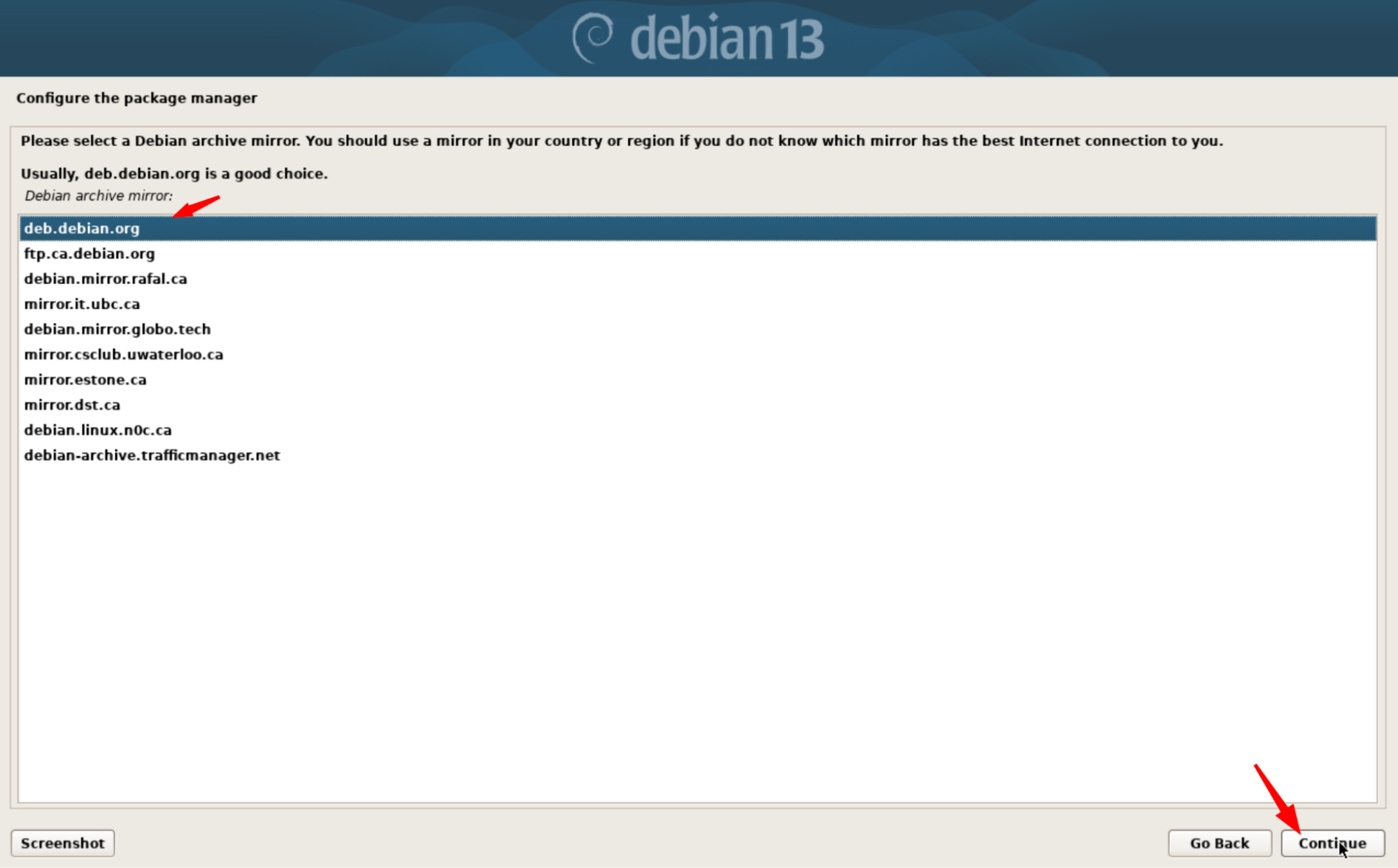 Sélectionnez le pays le plus proche de vous pour que l’installation télécharge les paquets depuis un miroir rapide. Pas besoin de trop réfléchir ici : même si vous choisissez un pays voisin, l’installateur détectera automatiquement le miroir le plus efficace.
