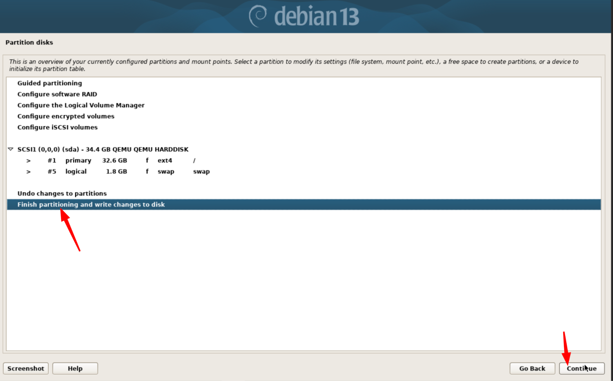 Vérifiez bien que vous sélectionnez le bon disque (utile surtout si vous avez plusieurs disques dans la VM ou un environnement multi-boot), puis cliquez sur Continue.