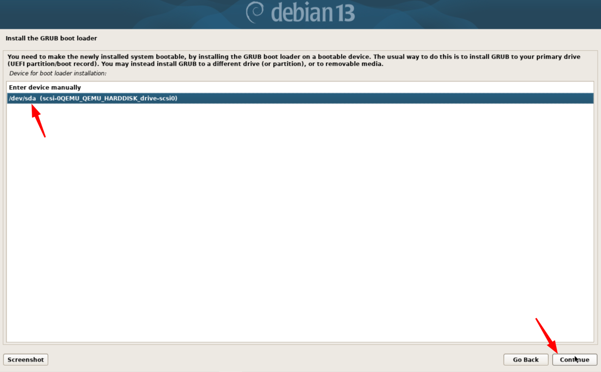 Choisissez le disque principal (/dev/sda) pour installer GRUB.