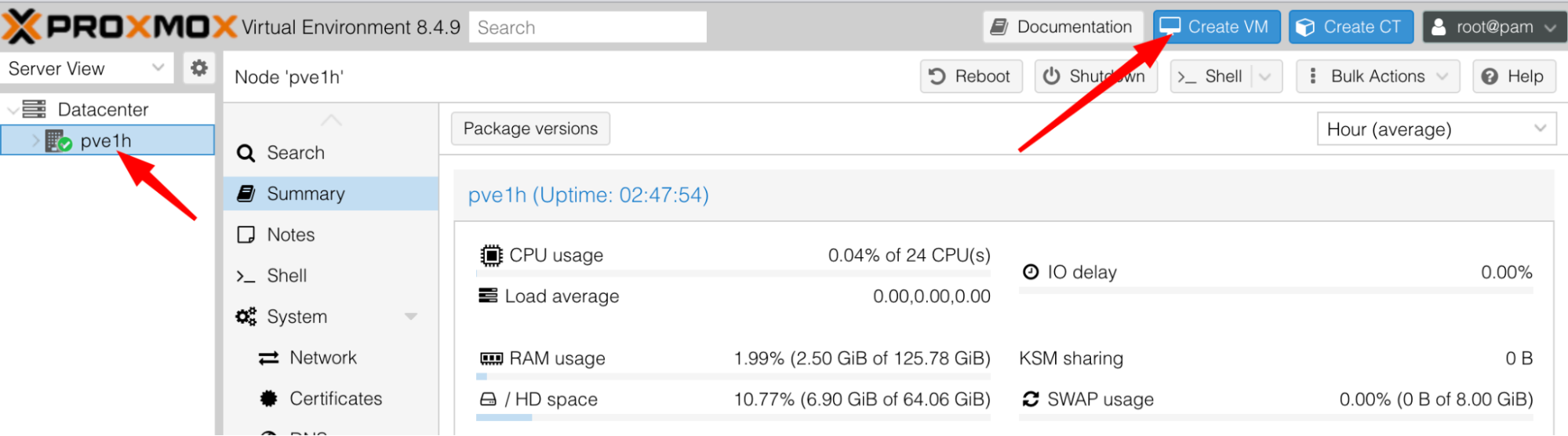 Node : sélectionnez le nœud sur lequel la VM sera créée (par défaut, pve ou autre nom de votre hôte).