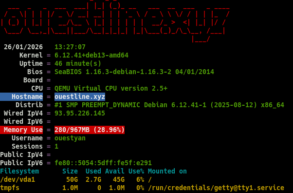 Linux ouestline.xyz 6.12.41+deb13-amd64 #1 SMP PREEMPT_DYNAMIC Debian 6.12.41-1 (2025-08-12) x86_64 GNU/Linux